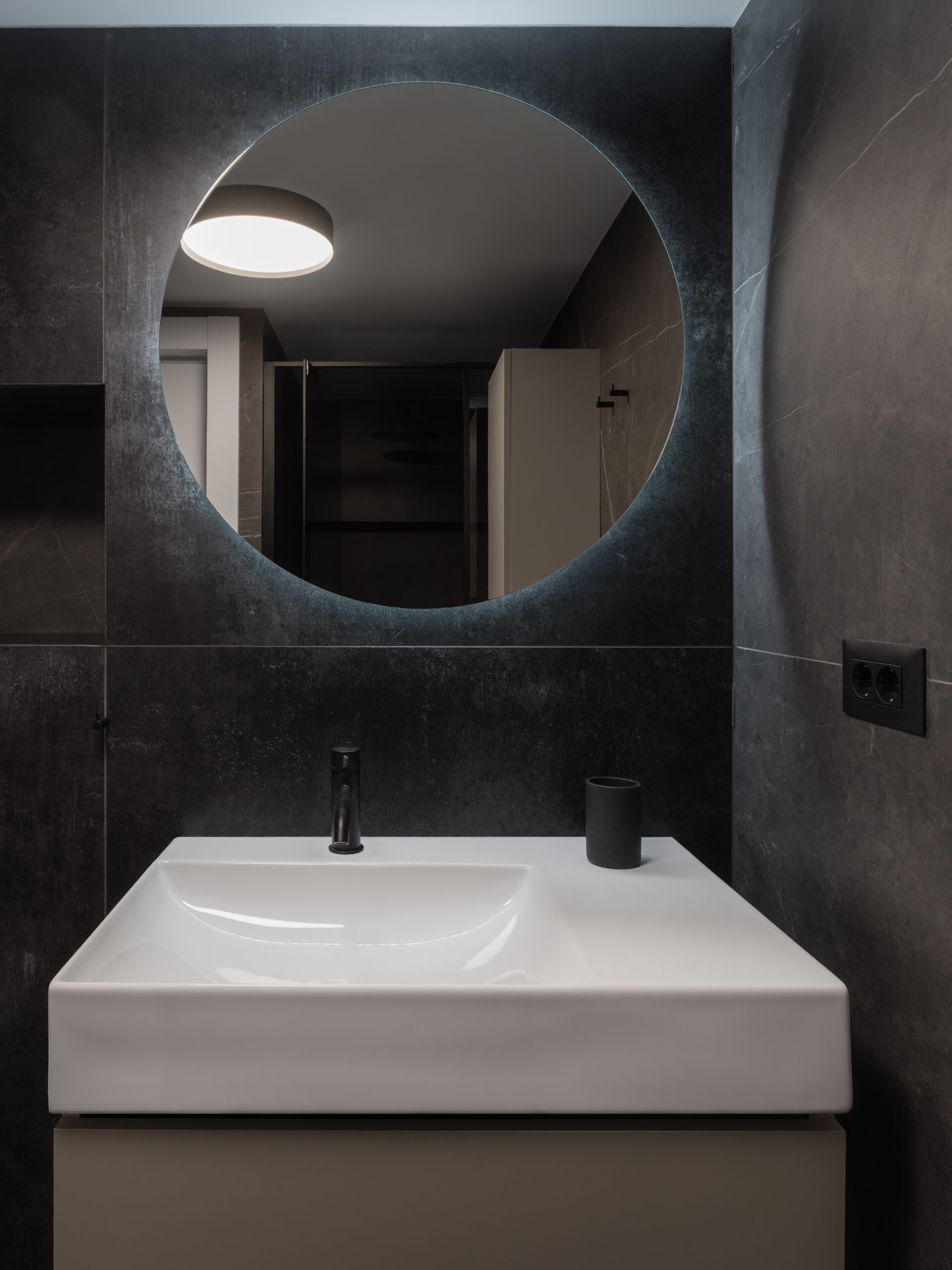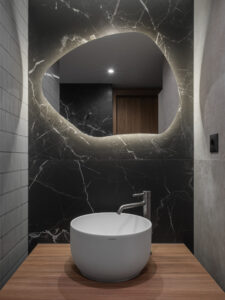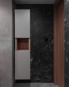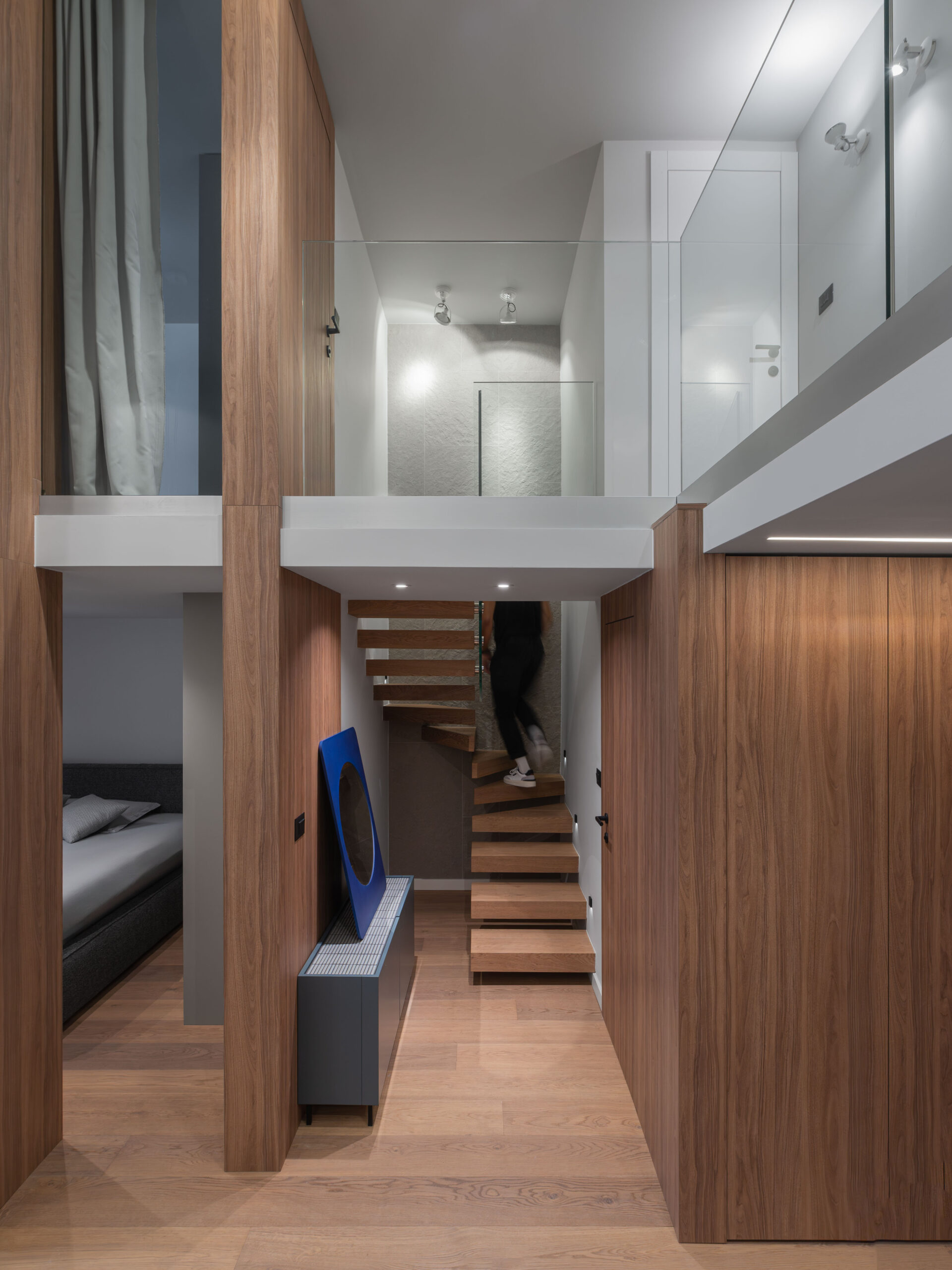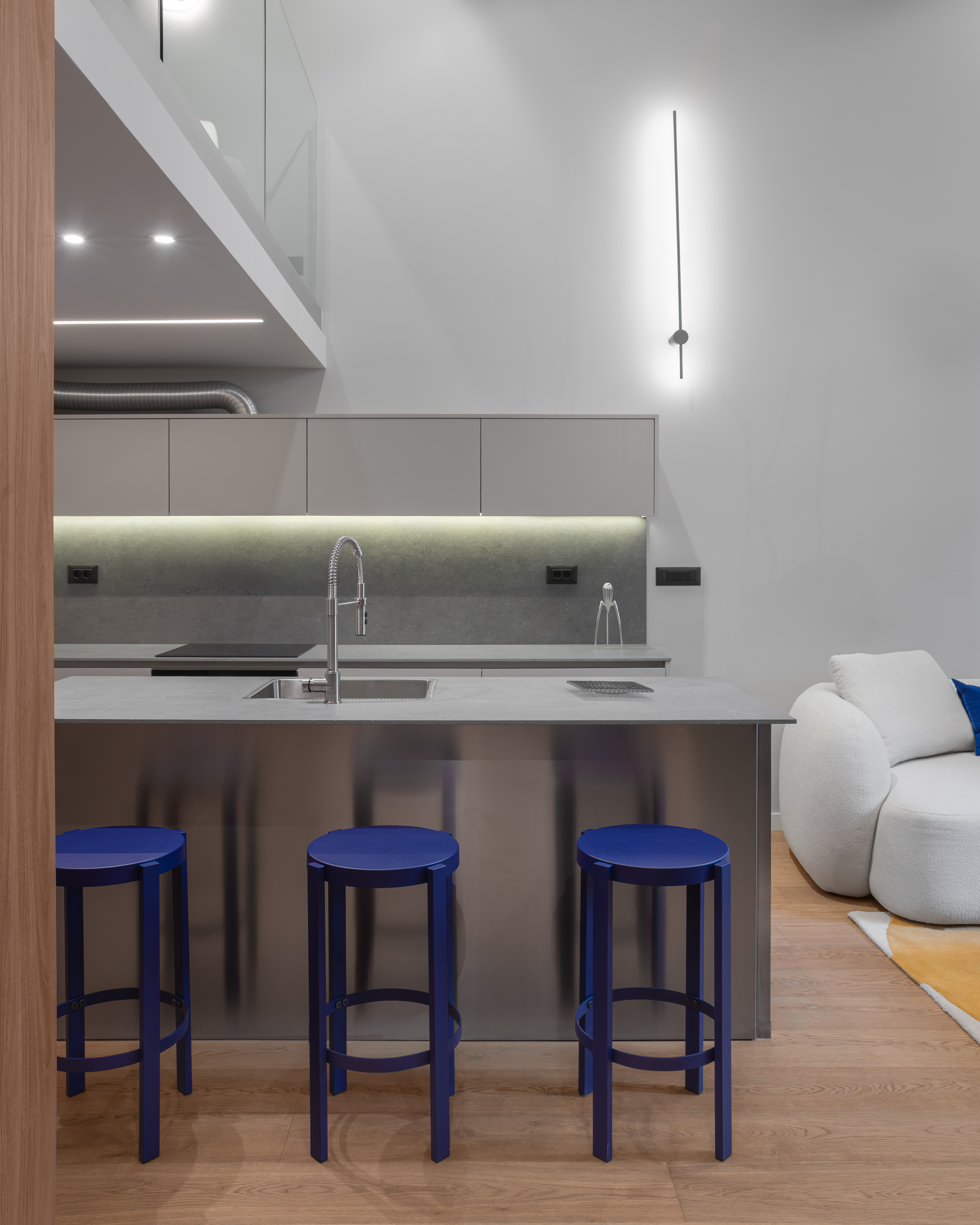 Kuhinja je smještena pod galerijom, kompaktno organizirana, s dominantnim otokom u potpunosti izvedenim od inoxa – hladnim, preciznim i industrijskim u karakteru. Sobe su asketski oblikovane, pročišćene od viška sadržaja, tretirane kao intimne spavaonice. Dnevni boravak, oko kojega se sve funkcije organski organiziraju, ponaša se kao unutarnji “trg” – polujavni prostor stana, mjesto susreta i cirkulacije, svojevrsni energetski centar doma.