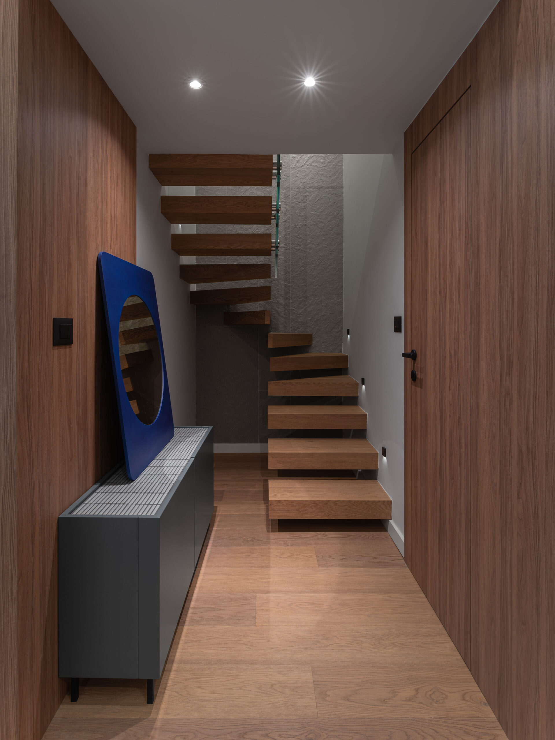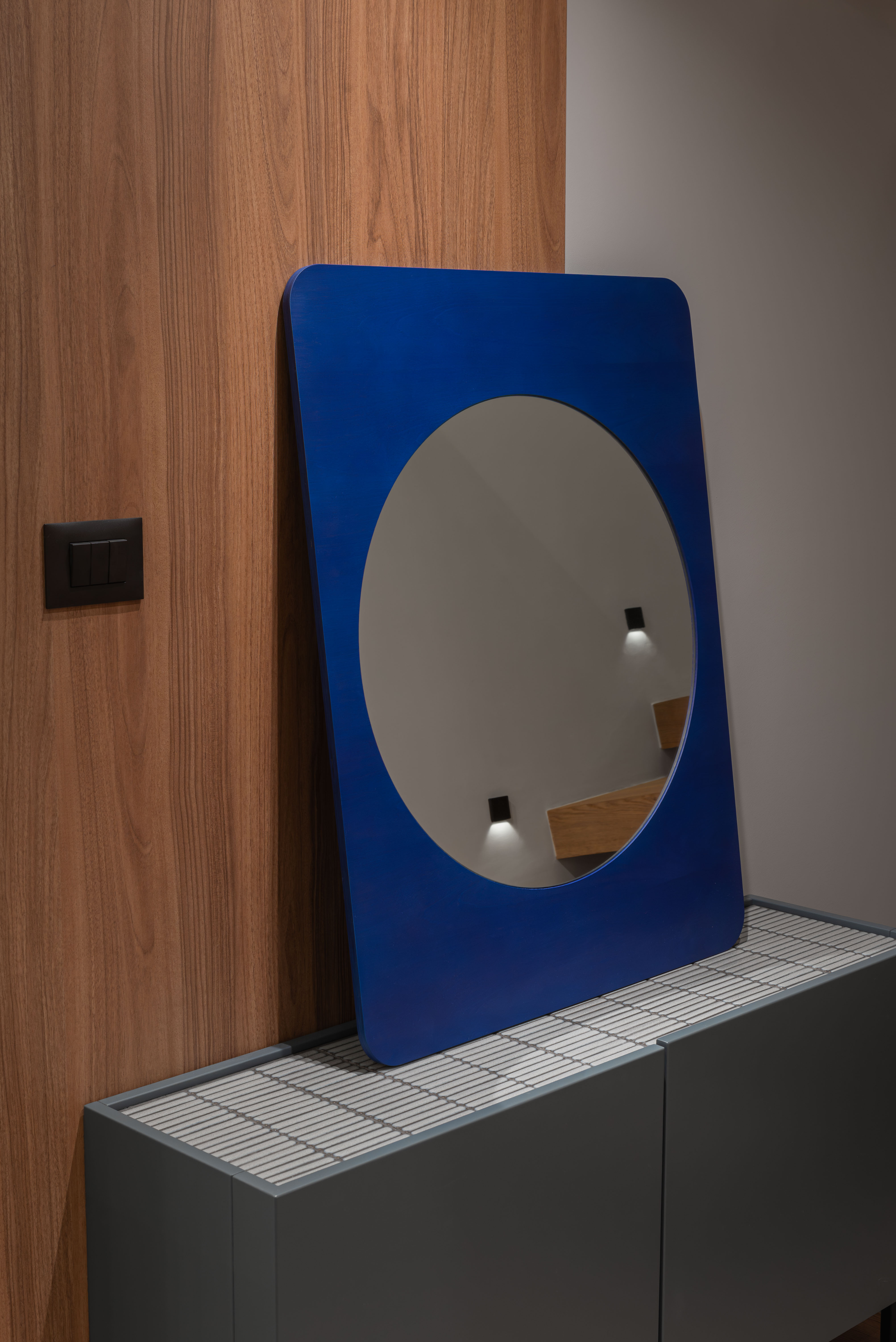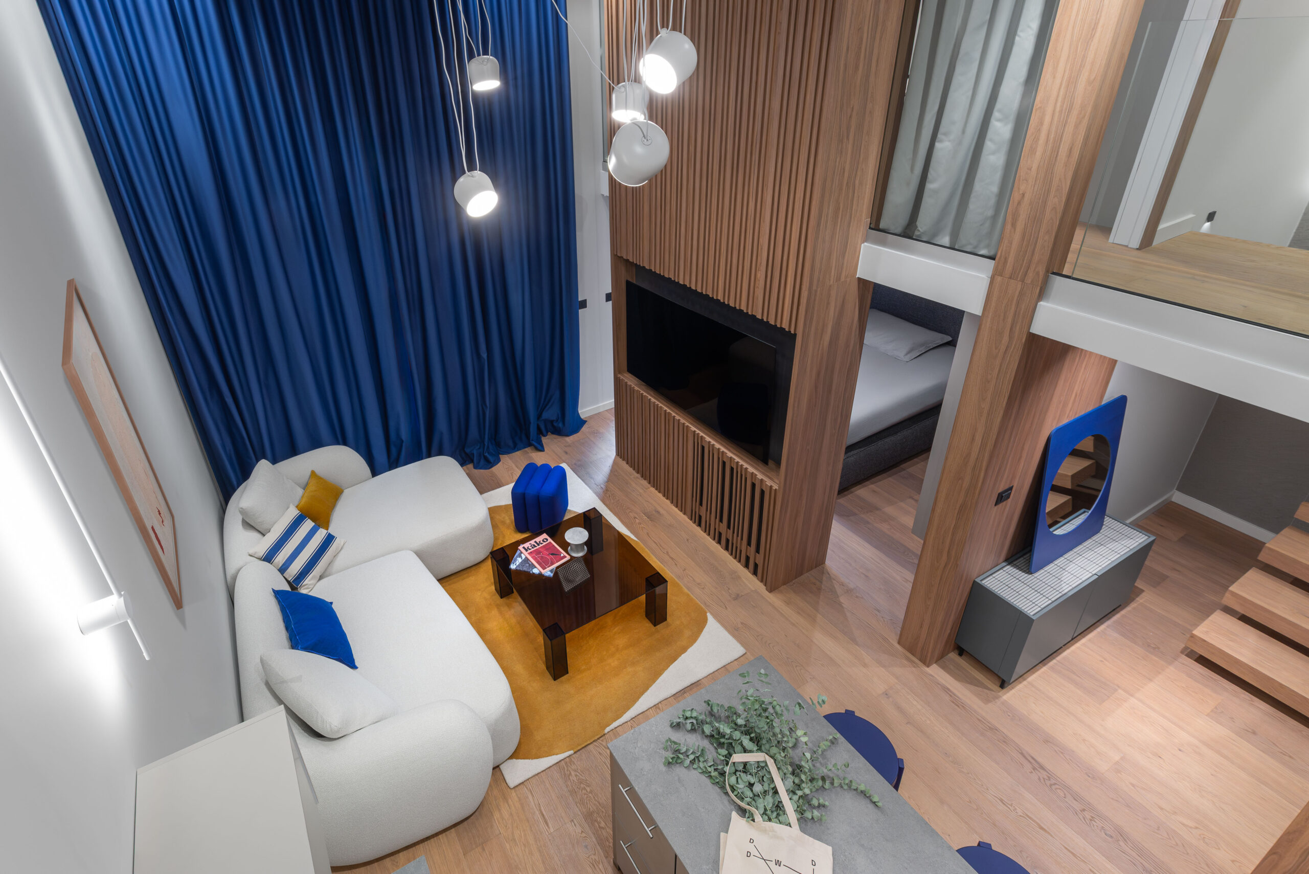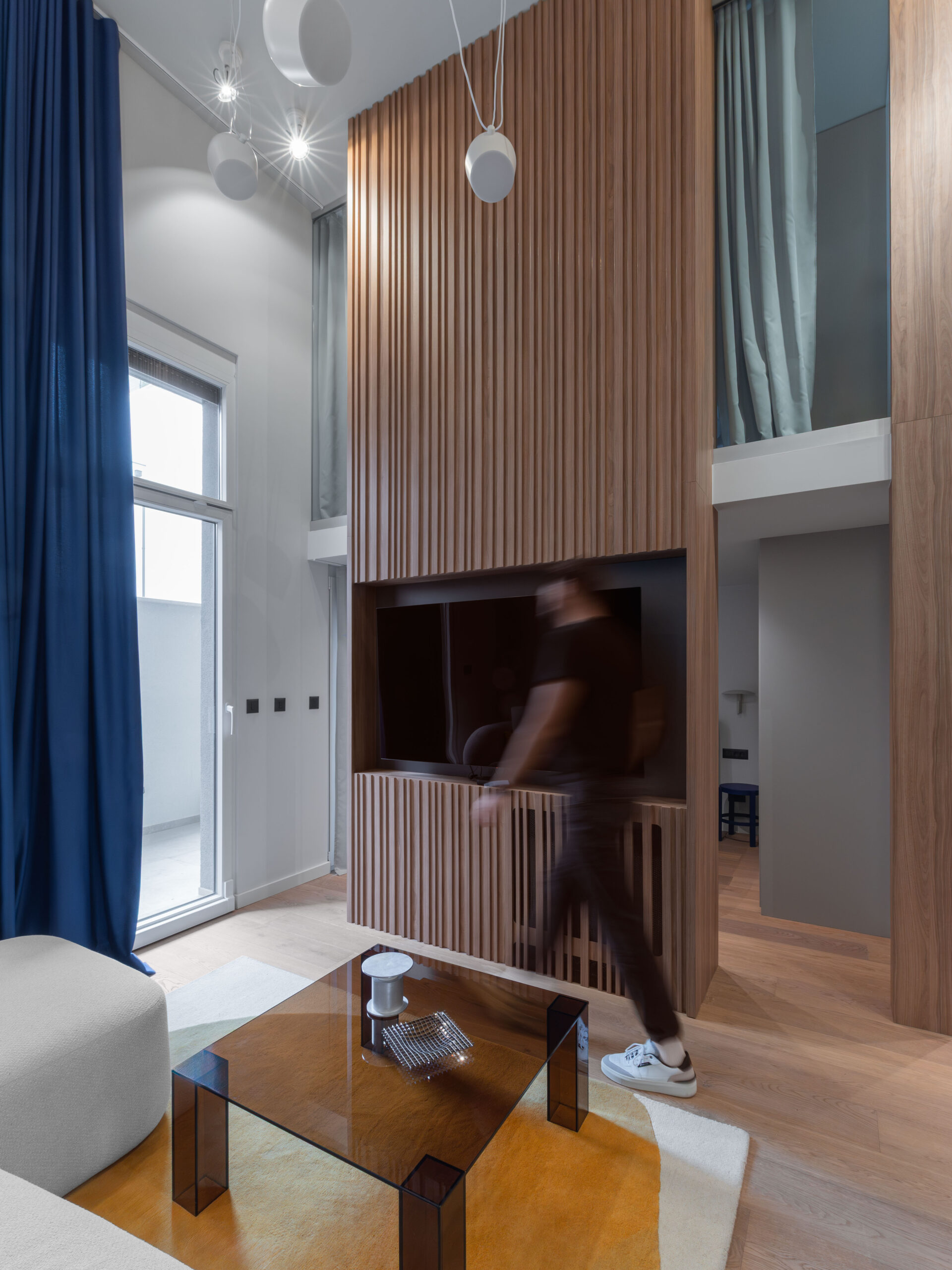 Materijalnost stana profilirana je kroz susret kontrasta: drvo i inox, toplo i hladno, meko i tvrdo, monumentalno i teksturalno. Drveni pod i visoki drveni totem unose taktilnost te vertikalno definiraju prostor, dok plava zavjesa, koja prati visinu totema, unosi potrebnu mekoću i fluidnost.