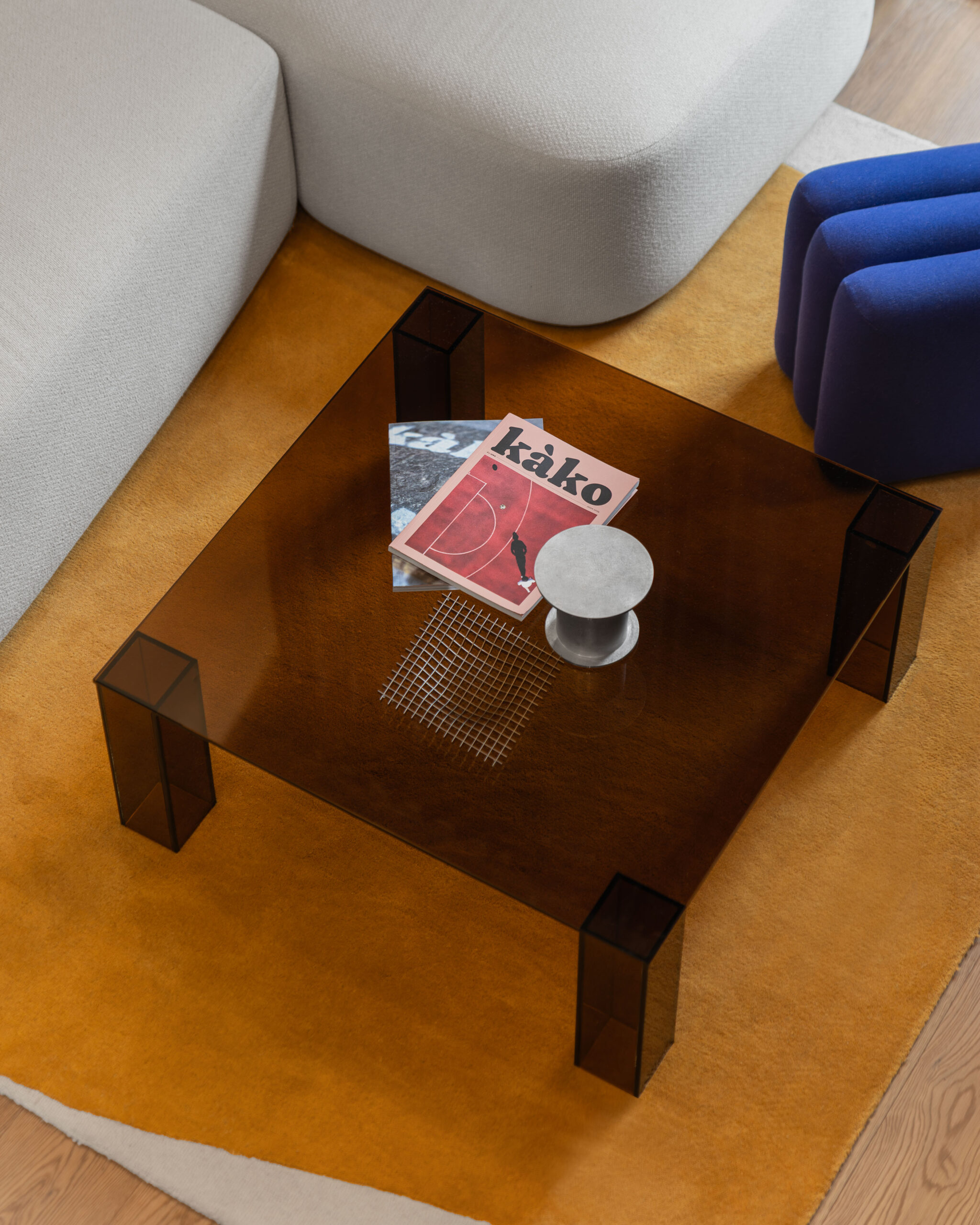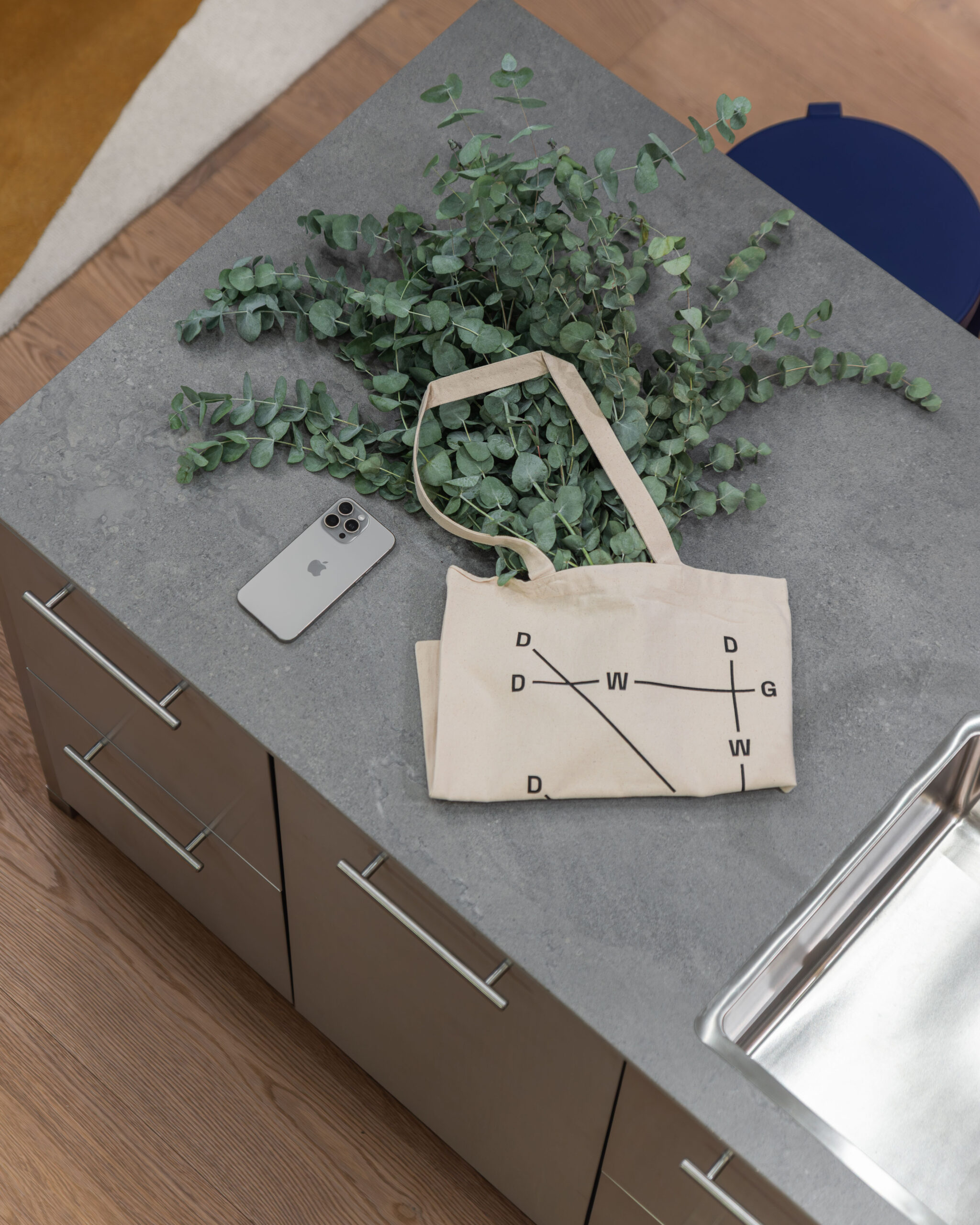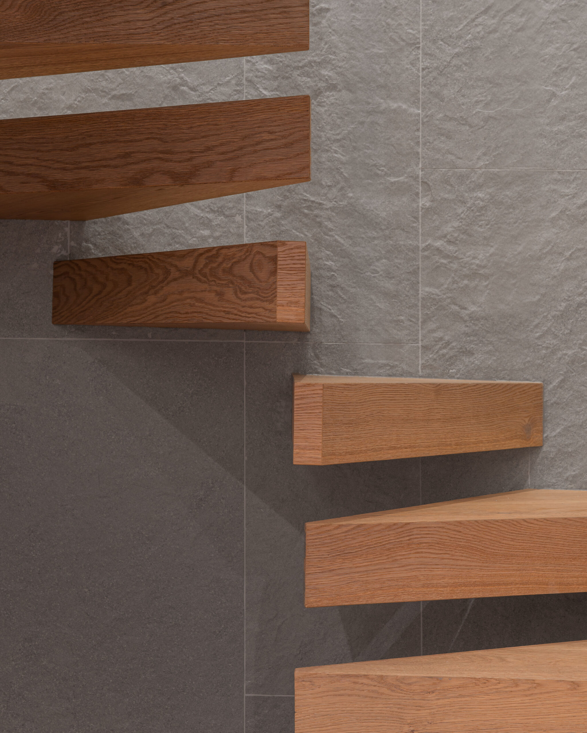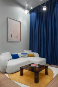 Materijalnost stana profilirana je kroz susret kontrasta: drvo i inox, toplo i hladno, meko i tvrdo, monumentalno i teksturalno. Drveni pod i visoki drveni totem unose taktilnost te vertikalno definiraju prostor, dok plava zavjesa, koja prati visinu totema, unosi potrebnu mekoću i fluidnost.