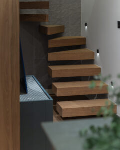 Oko tog snažnog središta nižu se funkcije – kuhinja, sobe i galerija koja služi kao biblioteka i intimni prostor za čitanje. Galerijski prostor lebdi unutar volumena i omogućuje vizualne presjeke te slojevitost doživljaja prostora.