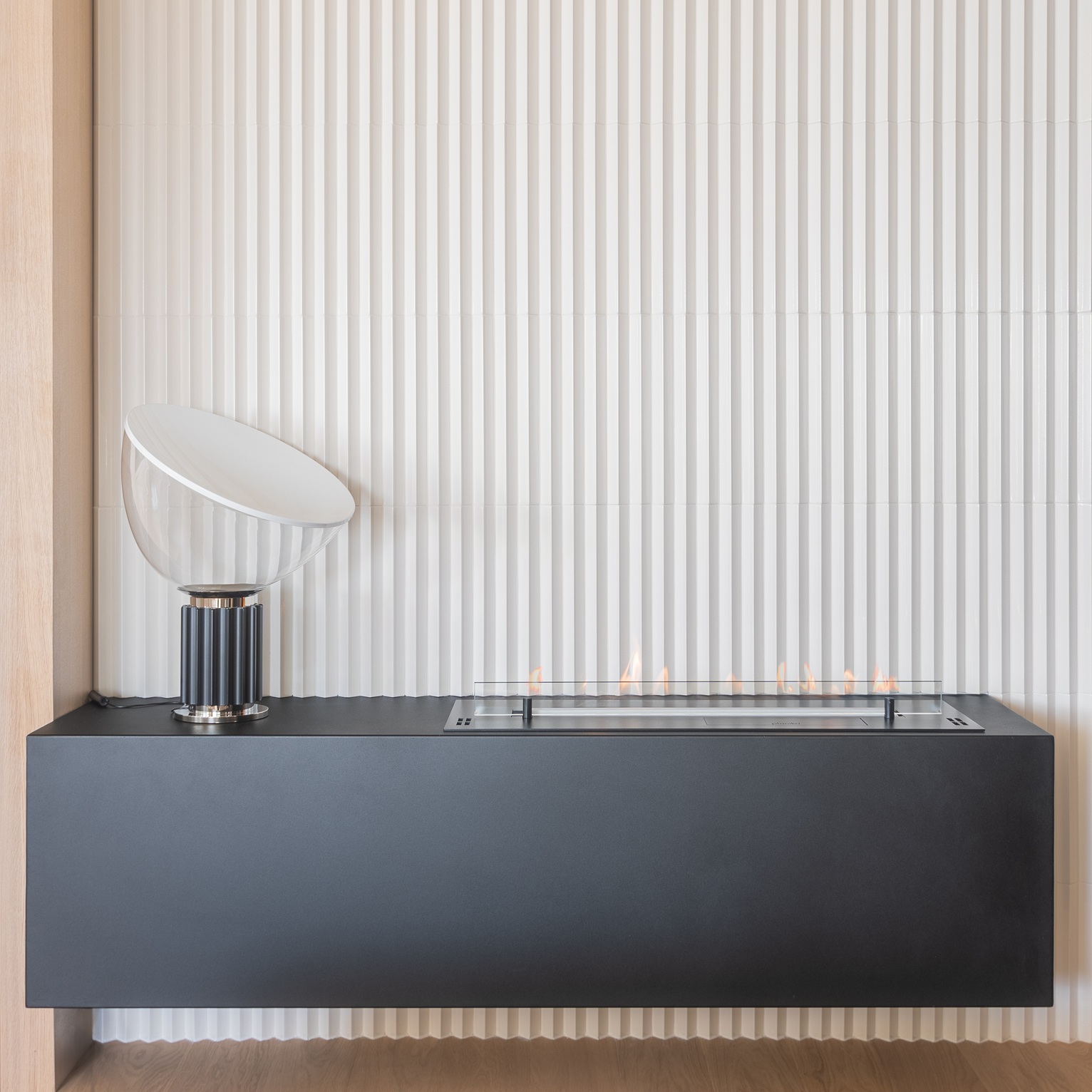 Ulazna zona oblikovana je s jednakom pažnjom kao i ostatak stana. Obložena je bijelim reljefnim keramičkim pločicama koje se nenametljivo nadovezuju na kuhinjske površine te zidnu oblogu iza kamina, čime već pri ulazu nastaje dojam pročišćenosti, elegancije i prostorne povezanosti.