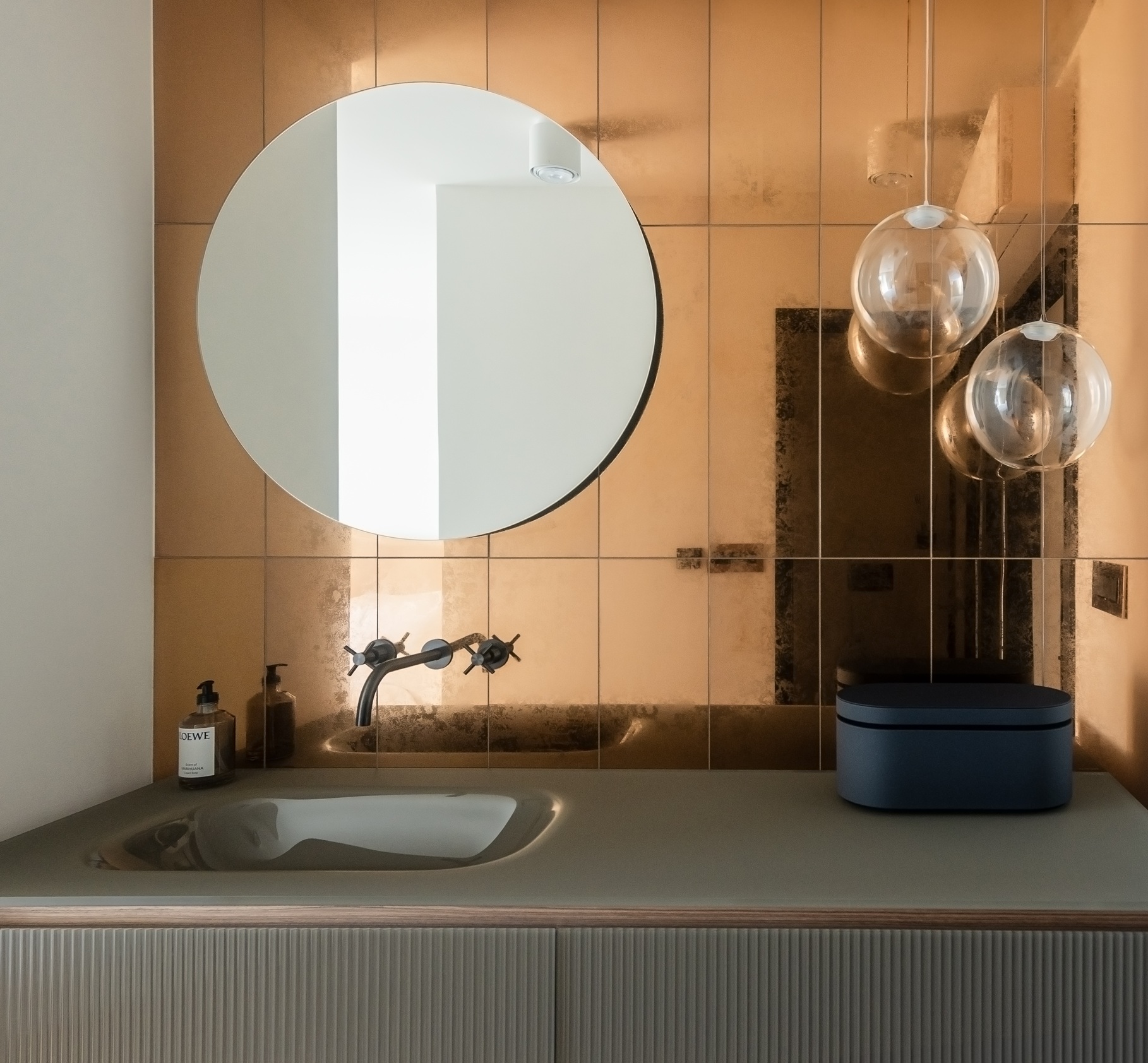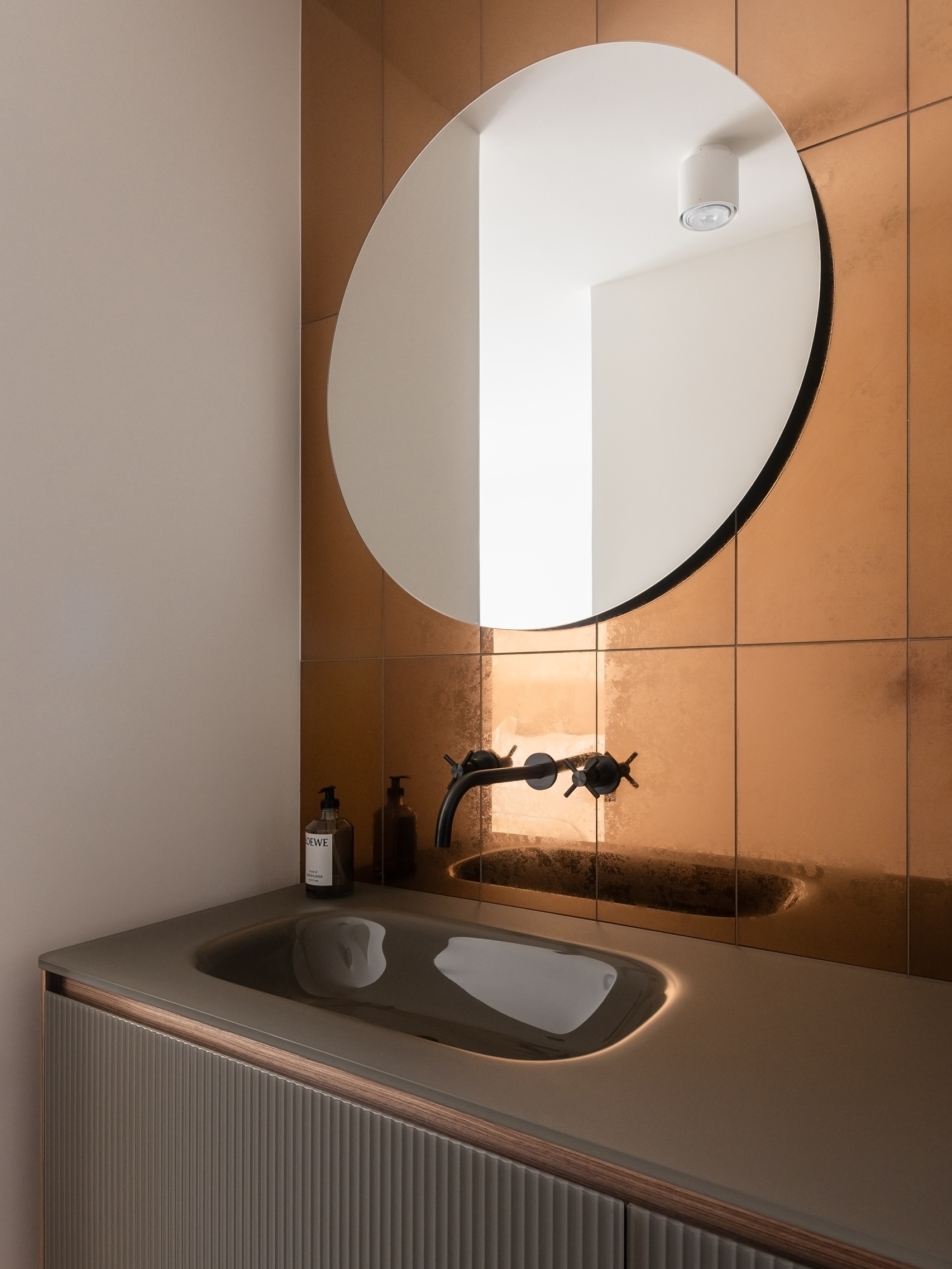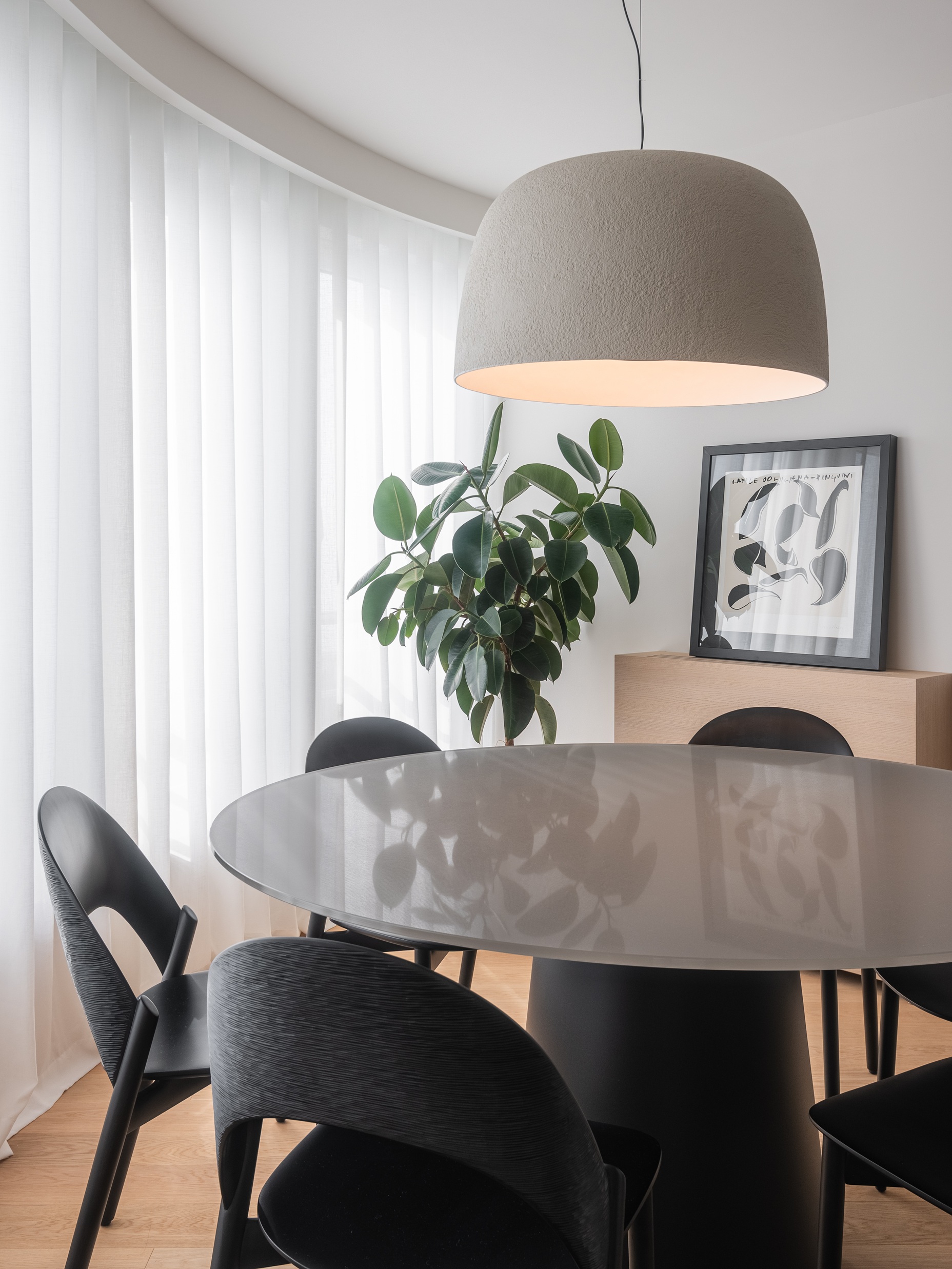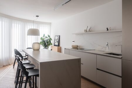 Stan se nalazi u zgradi starije gradnje, a njegovo prostorno oblikovanje proizlazi iz naslijeđene zakrivljene forme – konstruktivnog elementa koji je reinterpretiran kao središnji organizacijski motiv. Polukružni volumen preuzet je kao prostorni orijentir koji definira karakter cijelog interijera. U njegovu je središtu smještena kuhinja, postavljena kao žarišna točka dnevne zone oko koje se prirodno nižu blagovaonica, boravak i terasa, stvarajući protočan i funkcionalno povezan prostor.