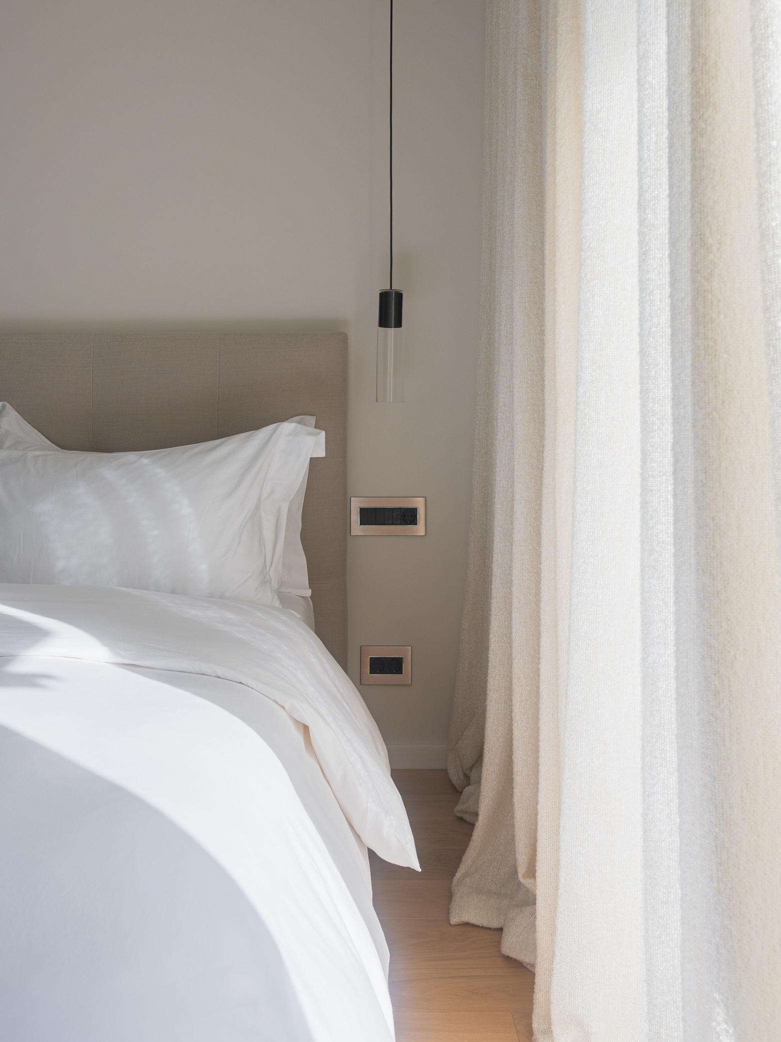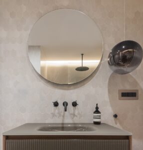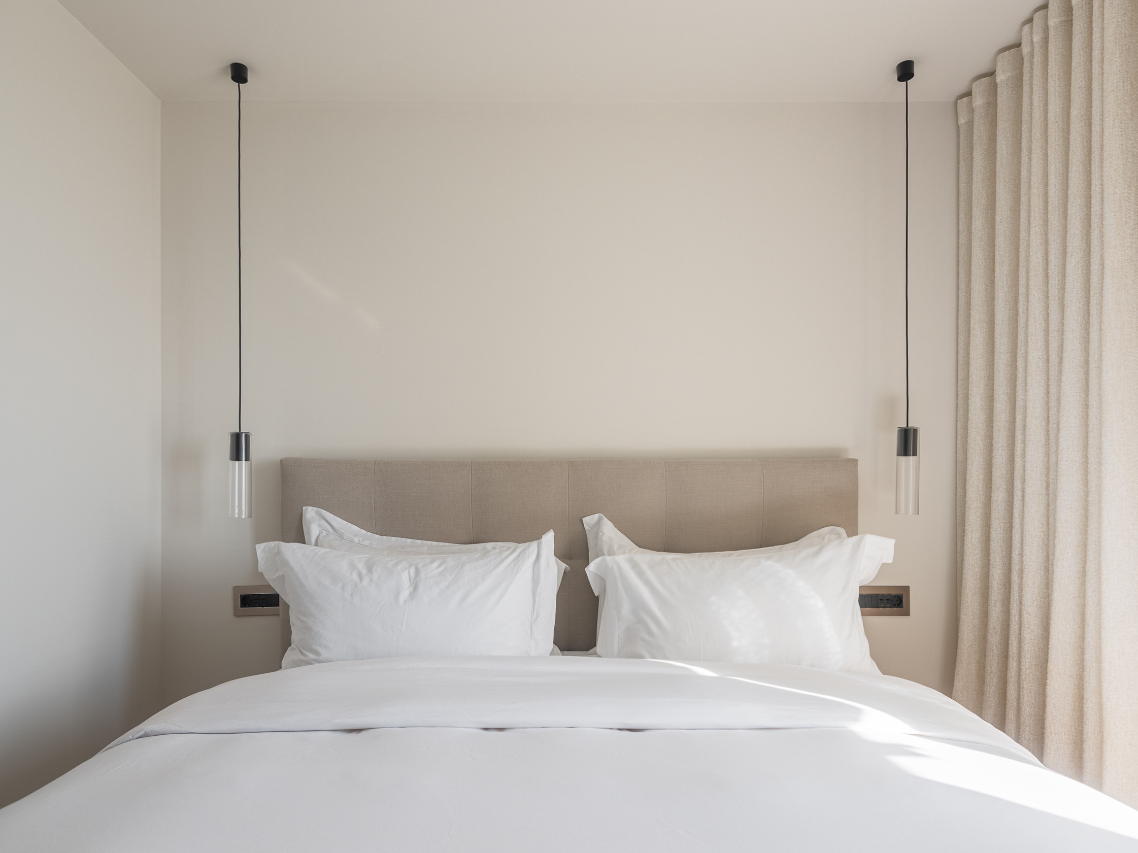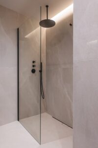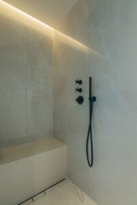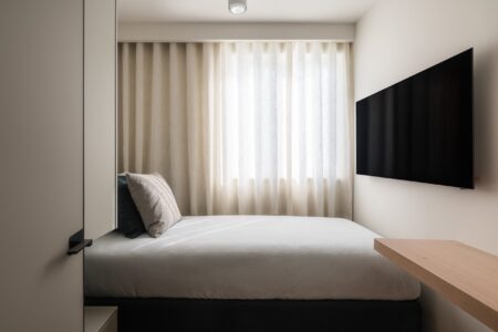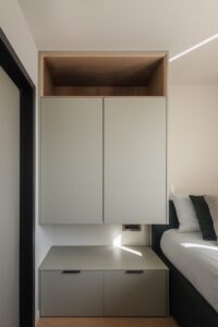Spavaća soba koncipirana je kao reinterpretacija hotelske privatnosti. Umjesto klasičnog odvajanja kupaonice, prostor je oblikovan kao otvorena cjelina – umivaonik i tuš komuniciraju s ostatkom sobe i vanjskim prostorom kroz panoramsko staklo. Time se brišu granice između funkcija, a dojam prostranosti dodatno je naglašen.