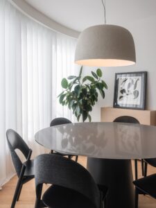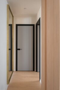 Posebna pažnja posvećena je zidnim oblogama koje imaju višestruku ulogu: estetski definiraju prostor, skrivaju vrata i integriraju servisne sadržaje u jedinstvenu arhitektonsku cjelinu. U središtu tlocrta nalazi se drveni totem – vertikalni element koji omogućuje kružno kretanje i prirodno dijeli dnevnu od noćne zone.