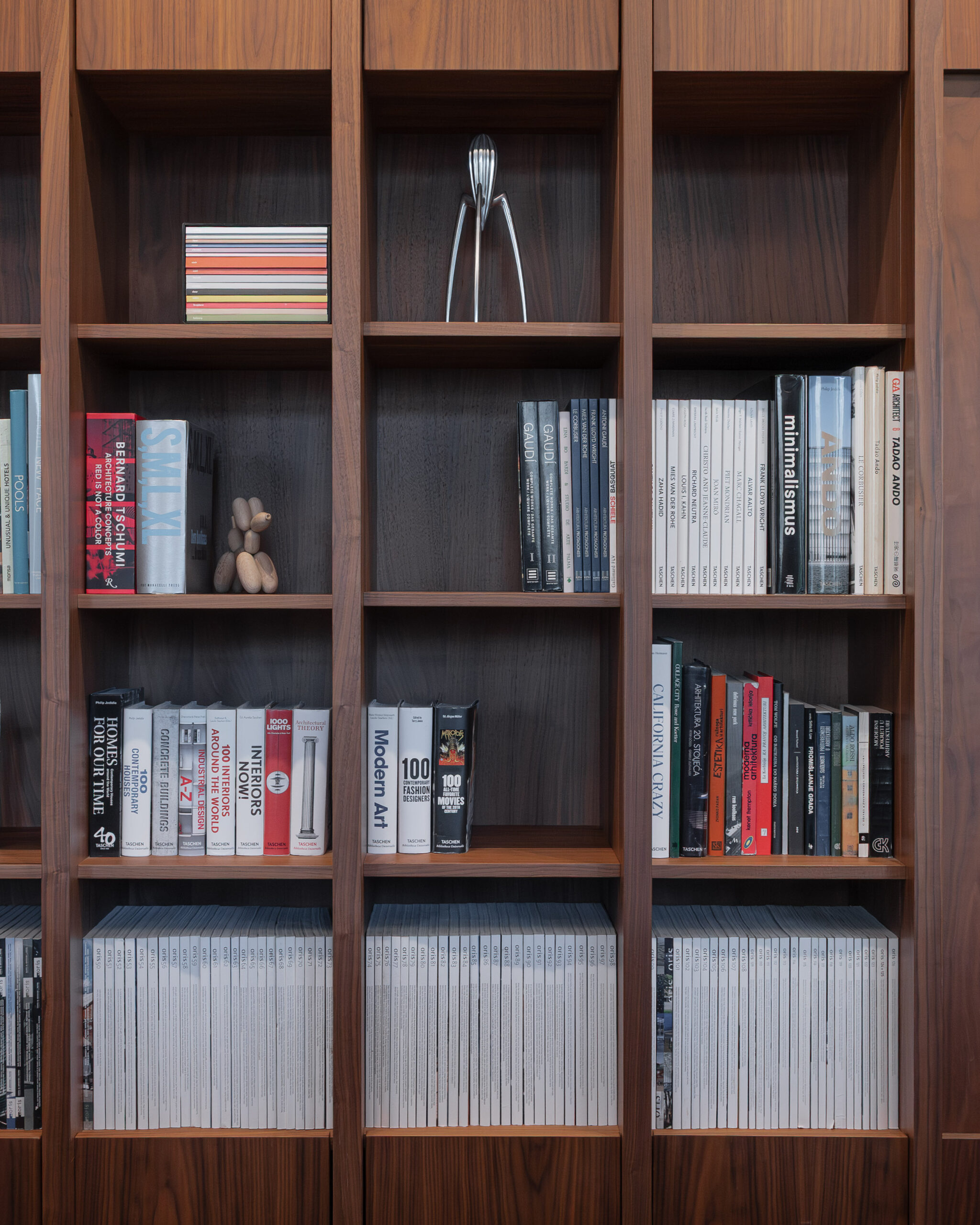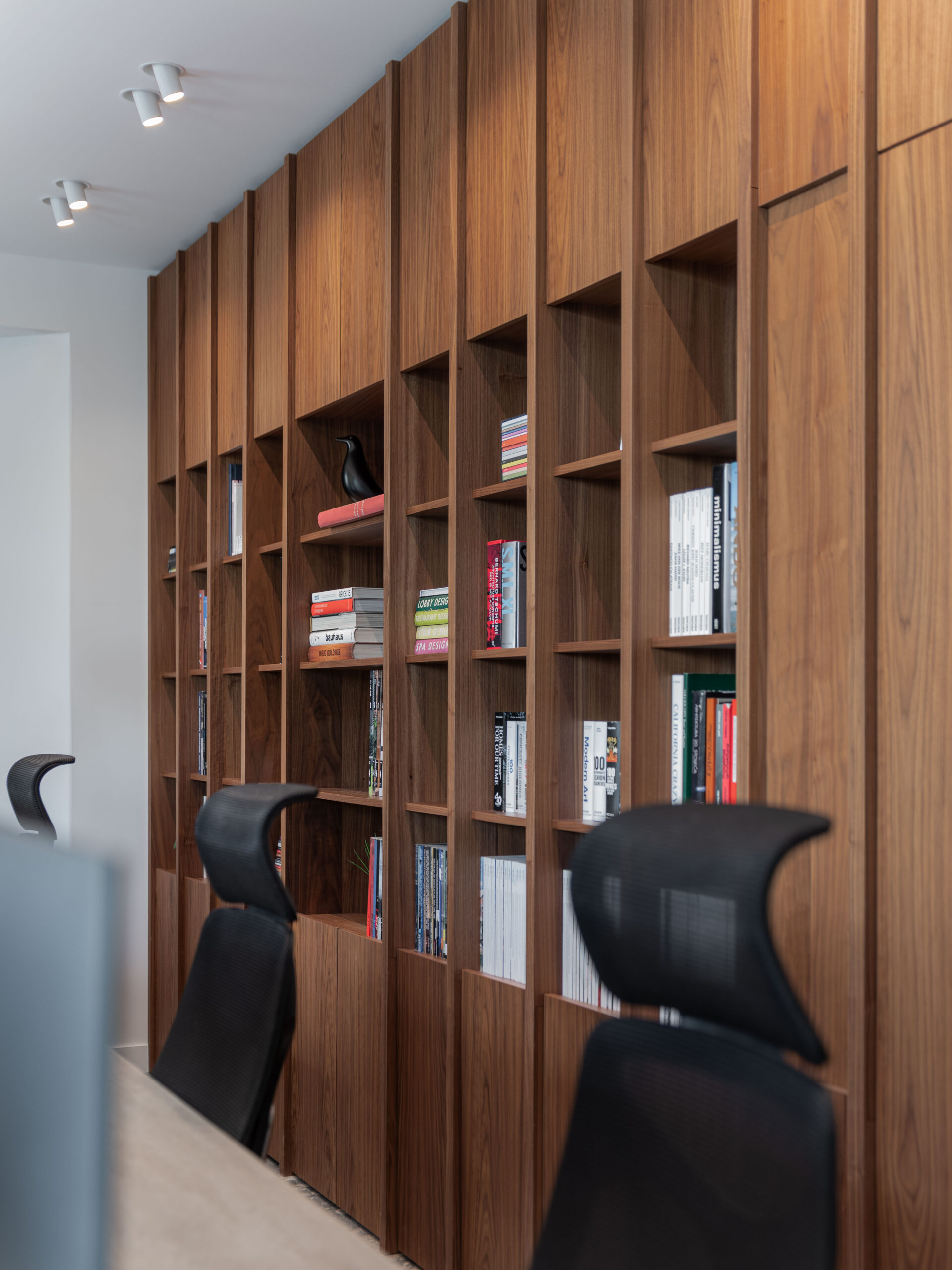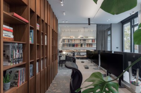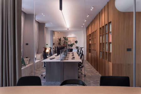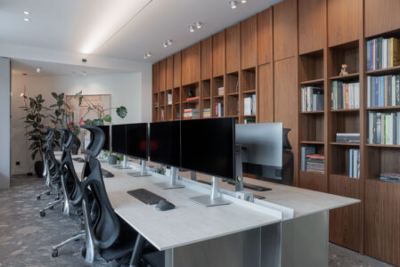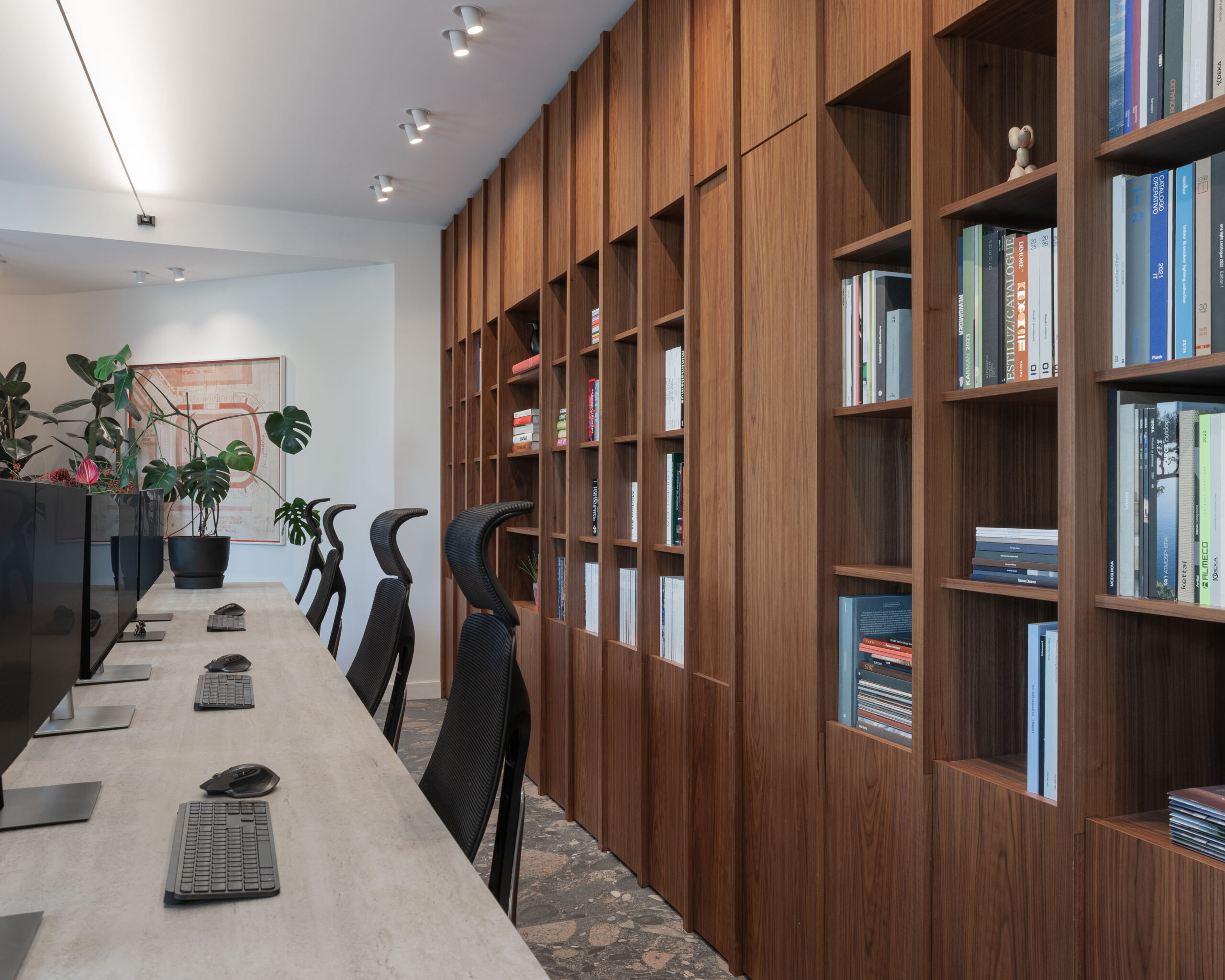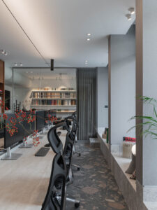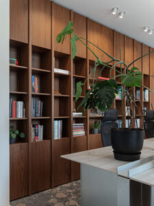 Uzduž zida suprotstavljenog staklenoj stijeni proteže se biblioteka s arhitektonskom literaturom – fizički i sadržajno “memorija” ureda. Produžetak radnog stola vodi u konferencijsku sobu, u kojoj se kontrast materijalnosti nastavlja: travertin radnog stola supostavlja se toplom hrastovom stolu, čime se prostor usidruje i smiruje.