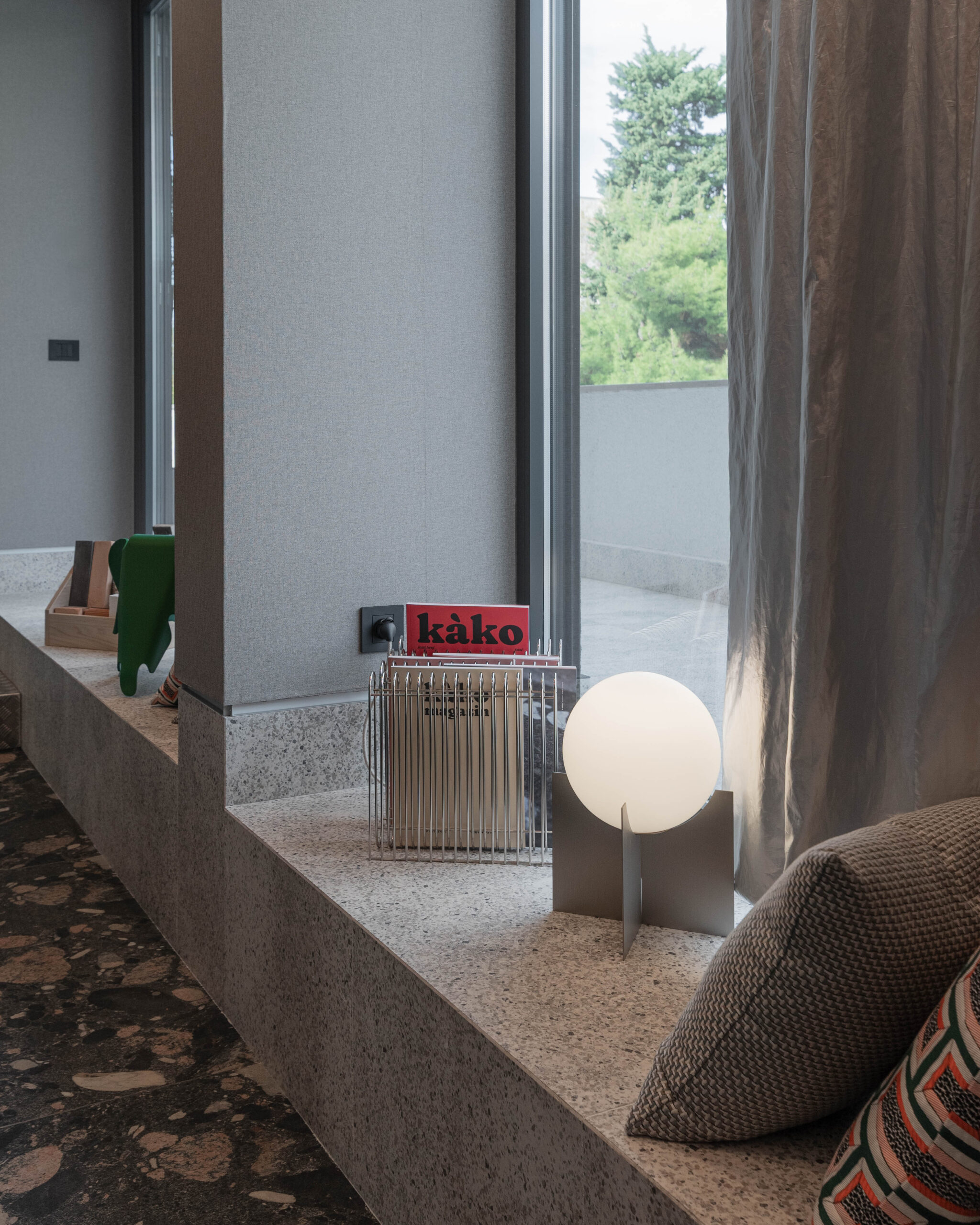 Ured je uvučen pola metra ispod razine sjeverne terase, što omogućuje da terasa, tretirana kao produžena polivalentna klupa, ulazi u interijer. Klupa postaje hibrid: prostor za konzultacije, prezentacije, odlaganje i boravak, a kontinuitet materijala briše granicu unutra – vani.