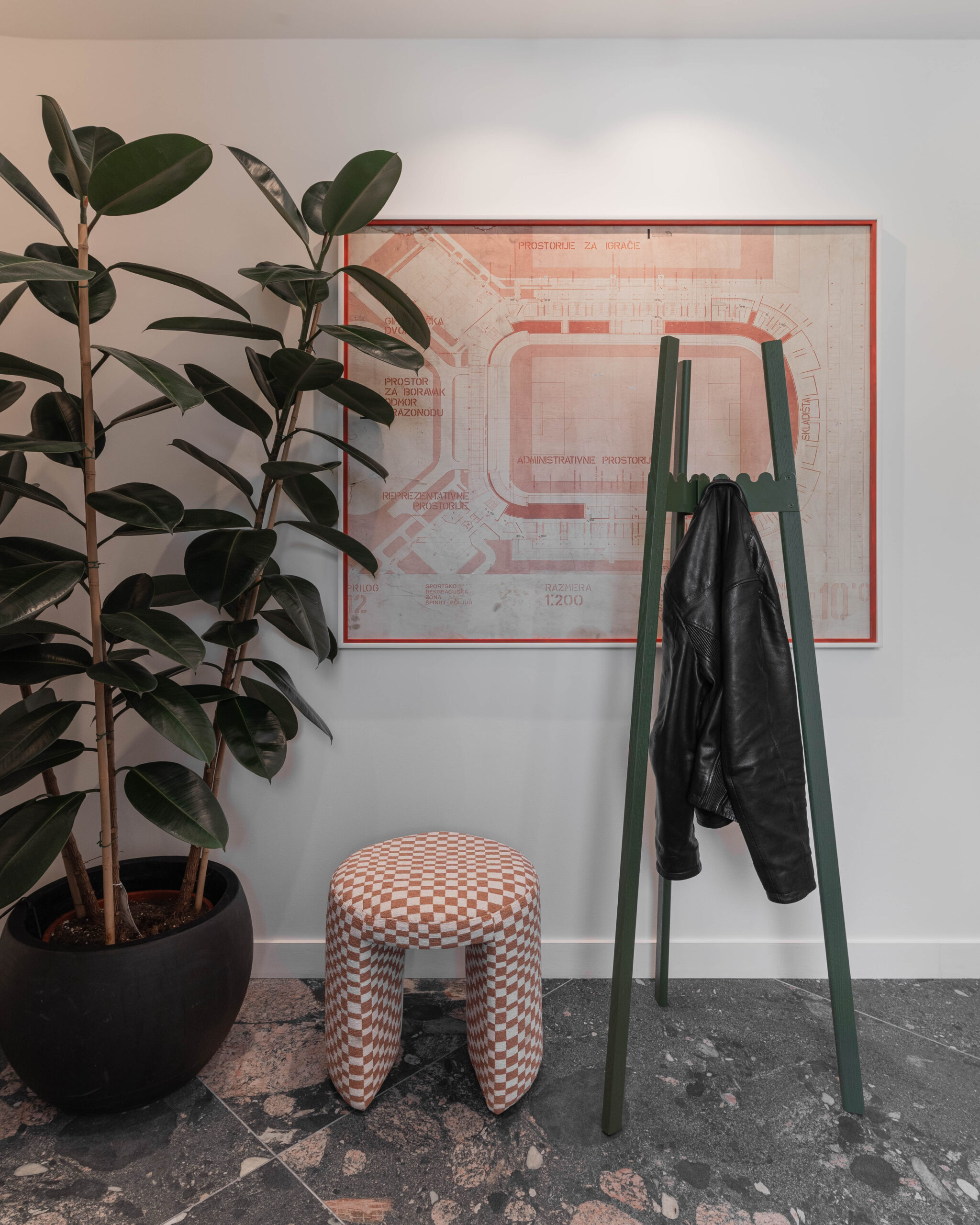 Kuhinja, često i neformalno mjesto susreta, oplemenjena je slikom umjetnika Stankovića, dok su kroz cijeli ured postavljeni odabrani umjetnički artefakti (Eamesova ptica, Starckovo cijedilo, Koonsov balon–pas), čime prostor dobiva sloj kulturnog i vizualnog identiteta. Posebno mjesto zauzima restauriran nacrt stadiona Poljud iz 1978.godine, pronađen na gradilištu, sada pretvoren u artefakt arhitektonske baštine.