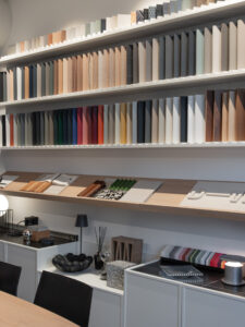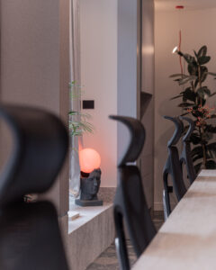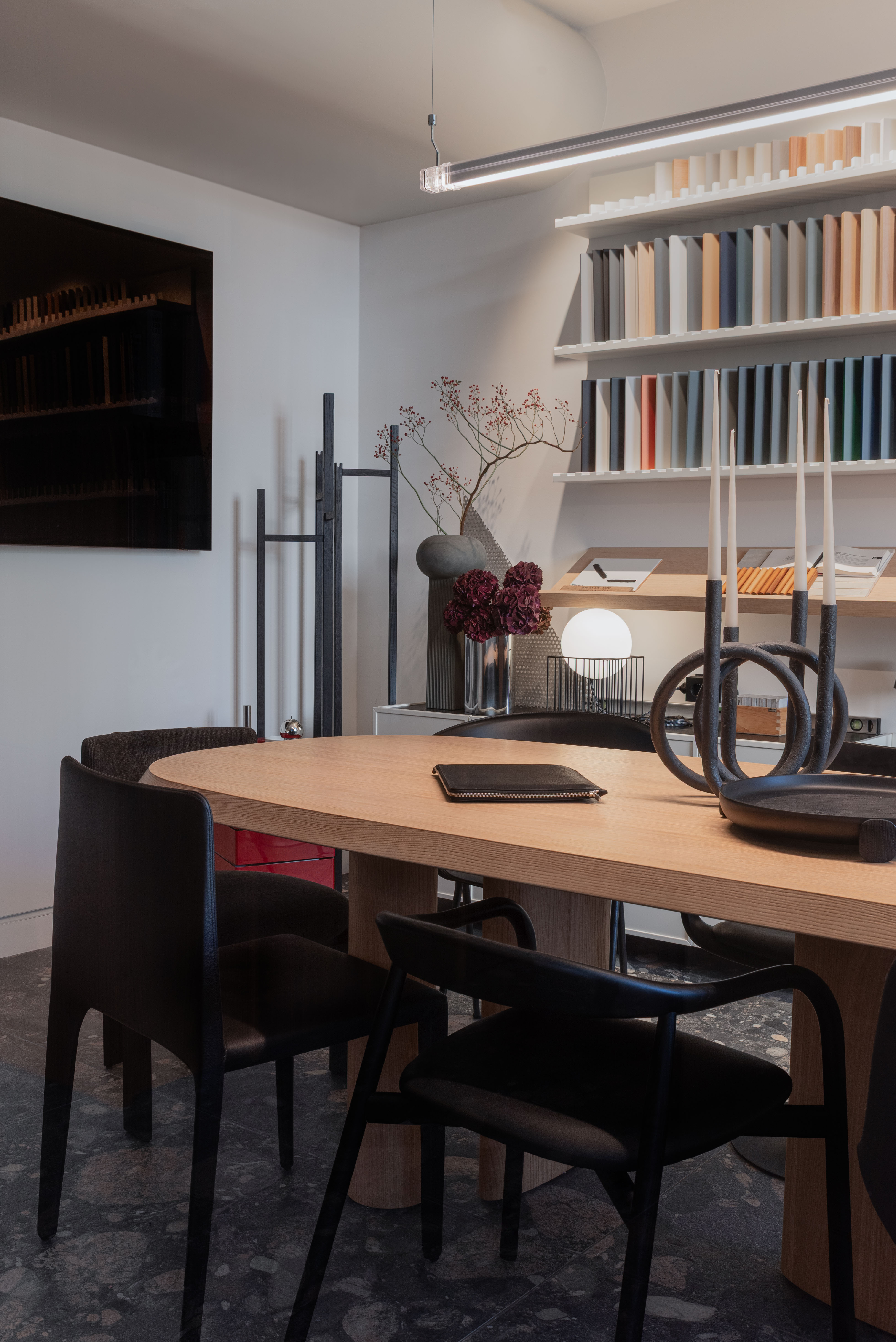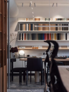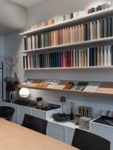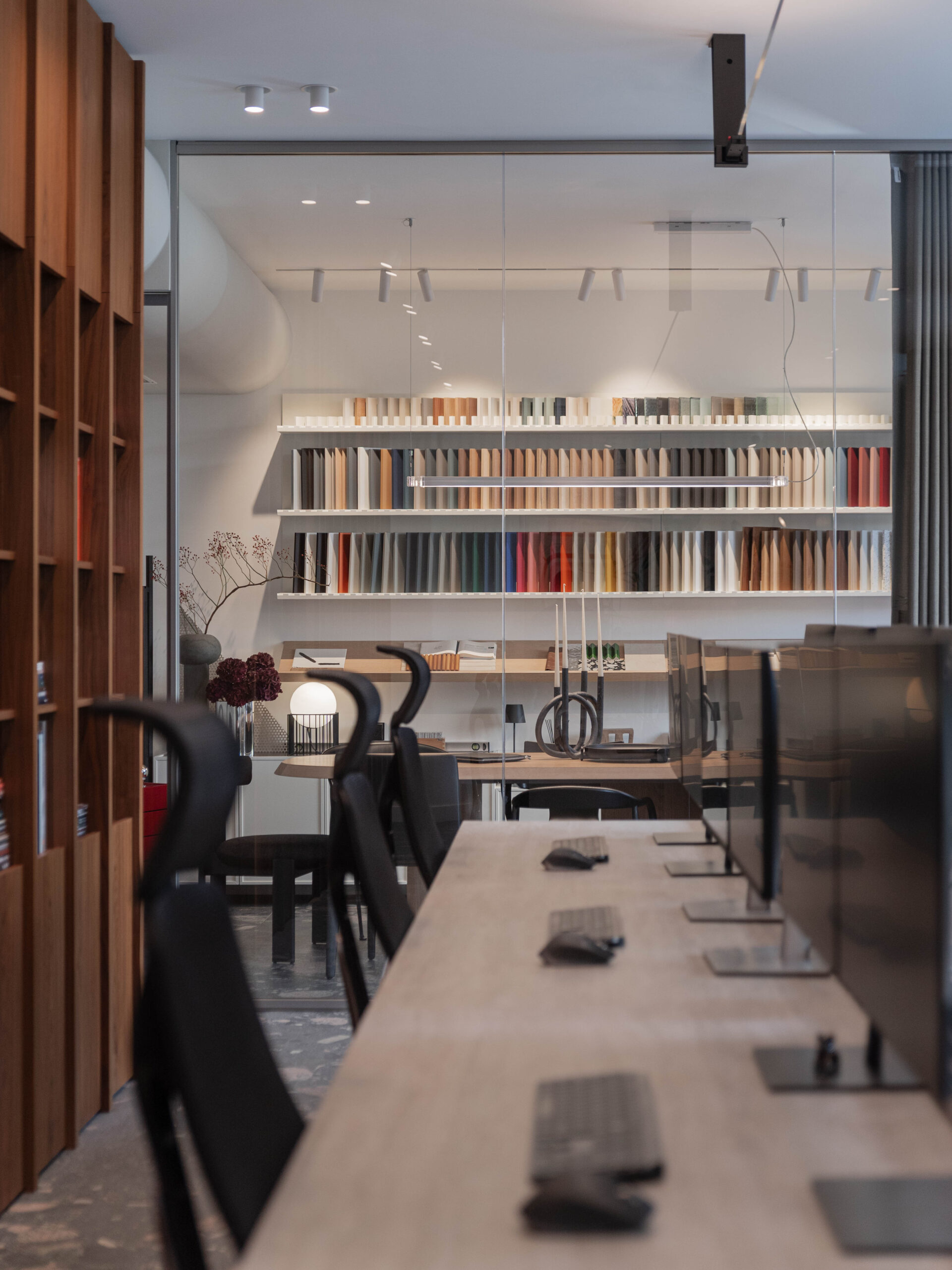 Materioteka, smještena uz konferencijsku zonu, funkcionira kao taktilni arhiv – mjesto okupljanja materijala: drva, pločica, tkanina, kamena, uzoraka i boja. Stol za sastanke postaje radna platforma za moodboardove, koncepte i prezentacije investitorima.