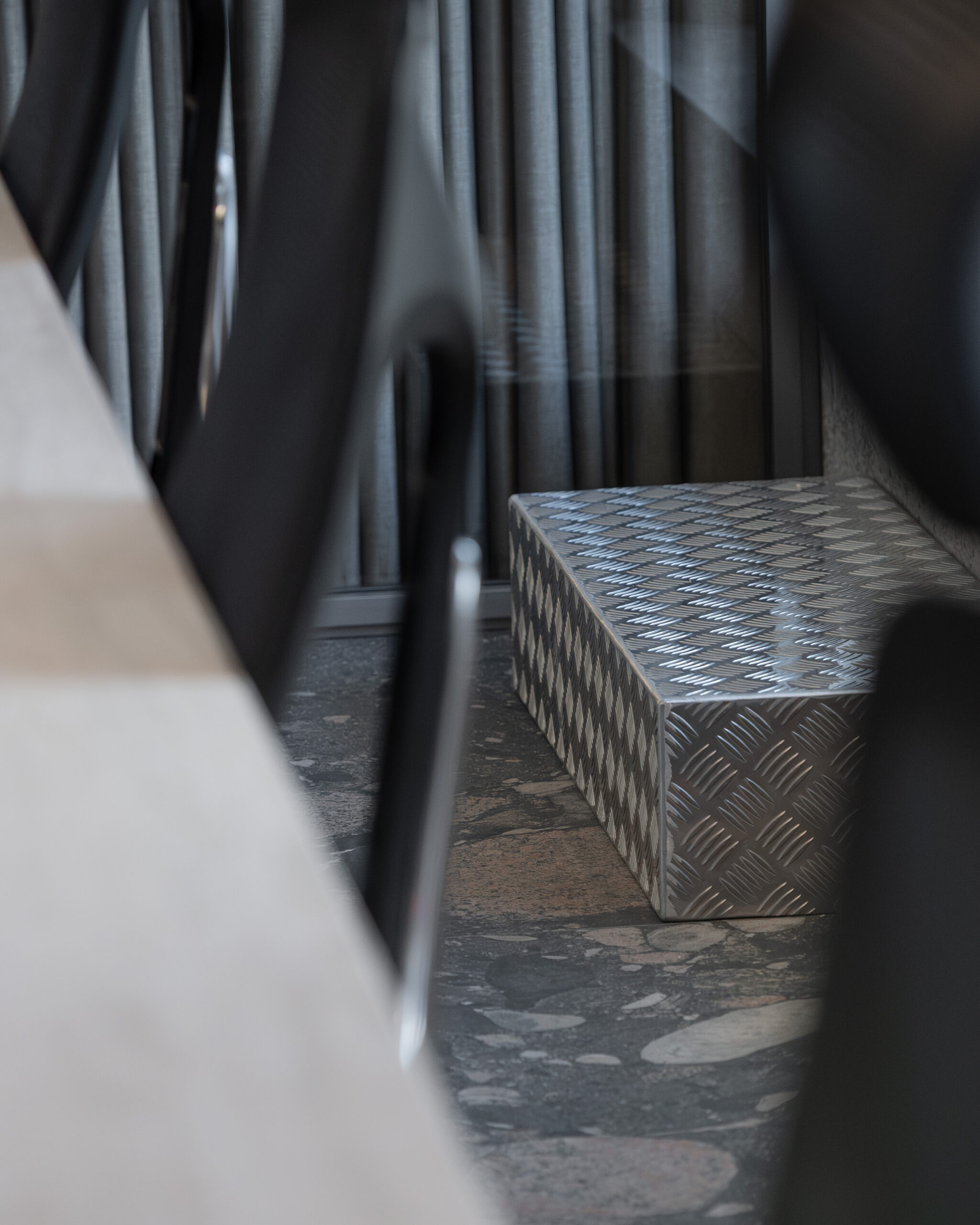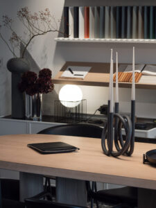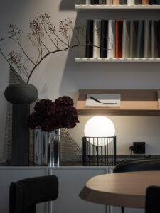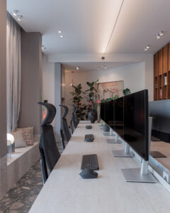 Središnji element prostora jest monumentalni zajednički stol s pločom od travertina, položen na masivne inox noge. Ovaj stol s osam radnih mjesta projektiran je kao jezgra komunikacije: arhitekti su pozicionirani prema središtu, čime se potiče dijalog, spontanost i kolektivno mišljenje – osnovni alati arhitektonskog procesa.